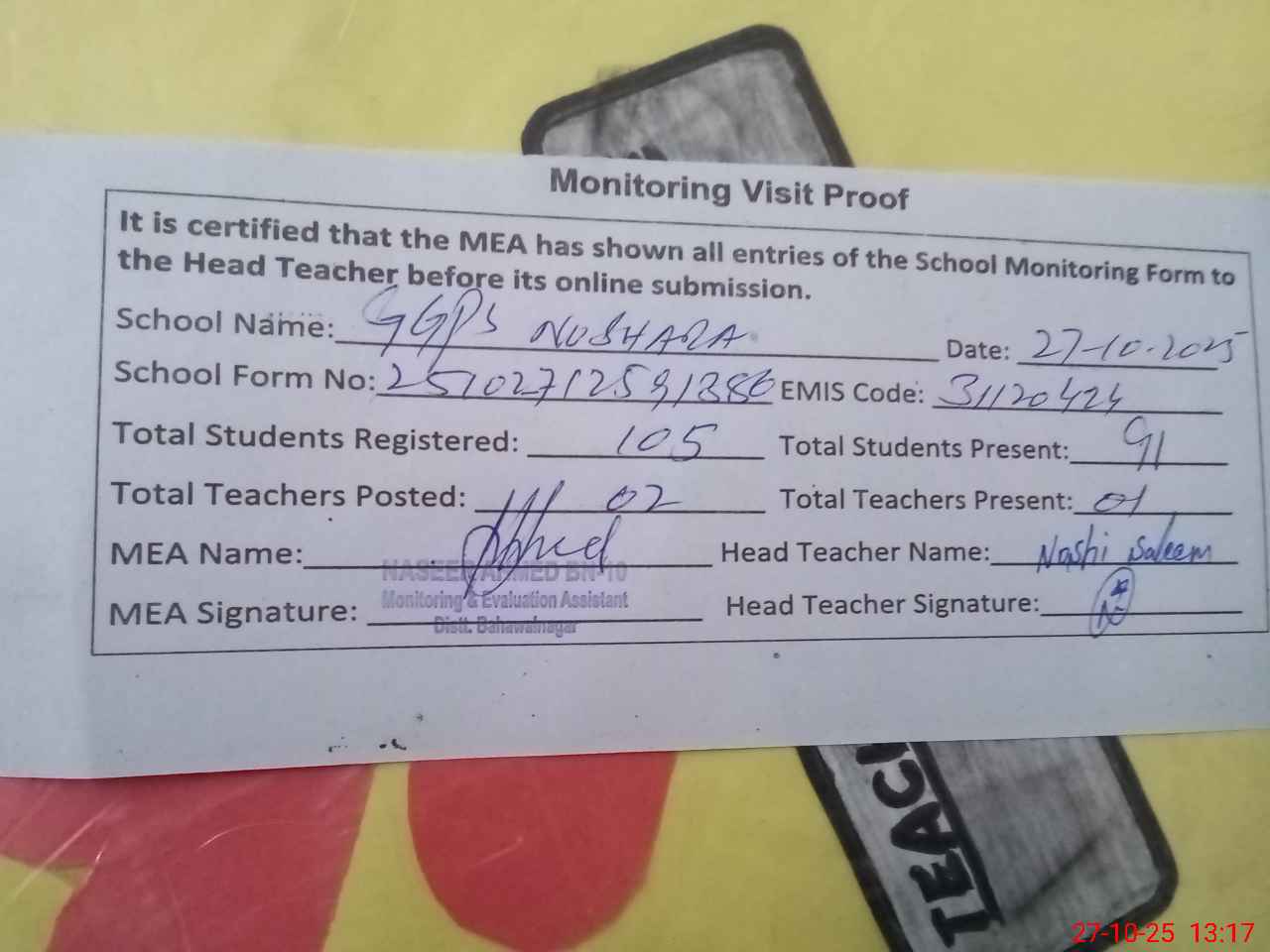 | Attendance Register | Head Teacher | MEA with School | Visit Proof |