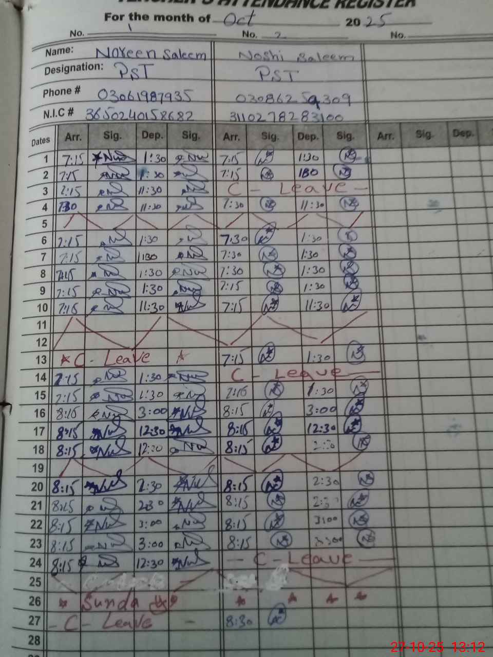 | CNIC | Full Name | Designation | R/C | Absence During Last Calender Month |