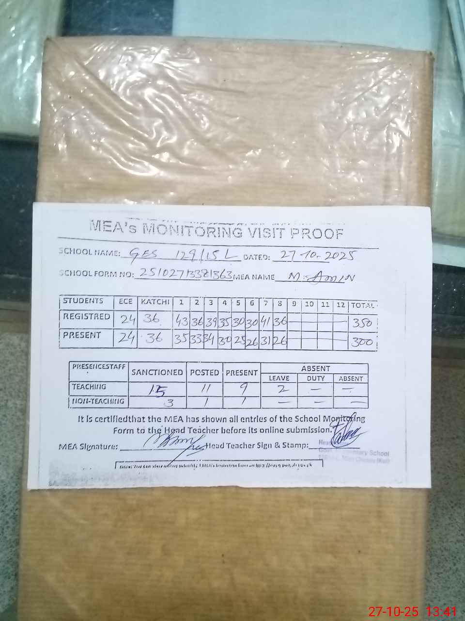 | Attendance Register | Head Teacher | MEA with School | Visit Proof |