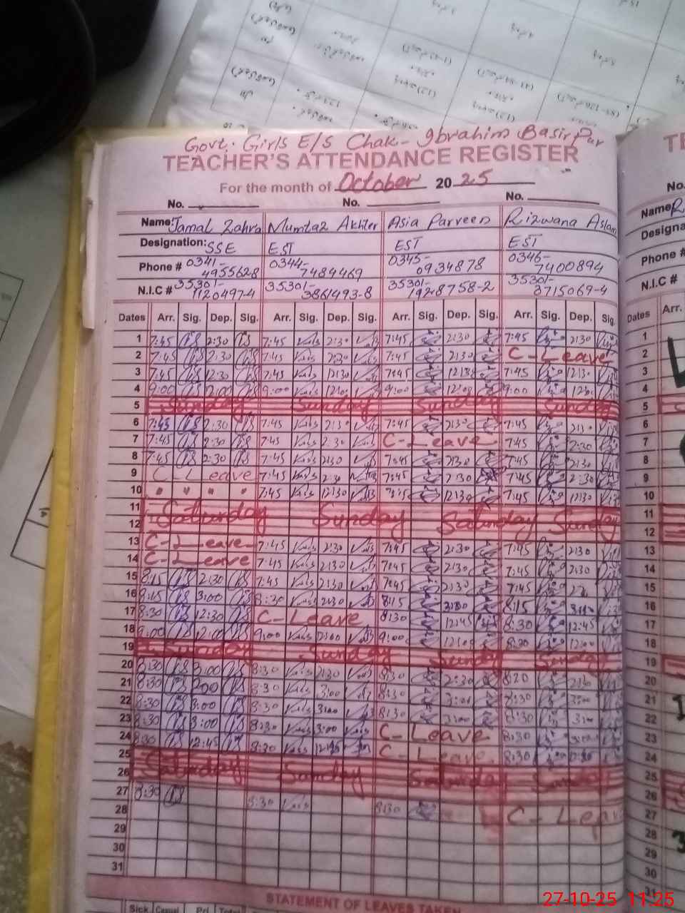 | CNIC | Full Name | Designation | R/C | Absence during last cal. month |