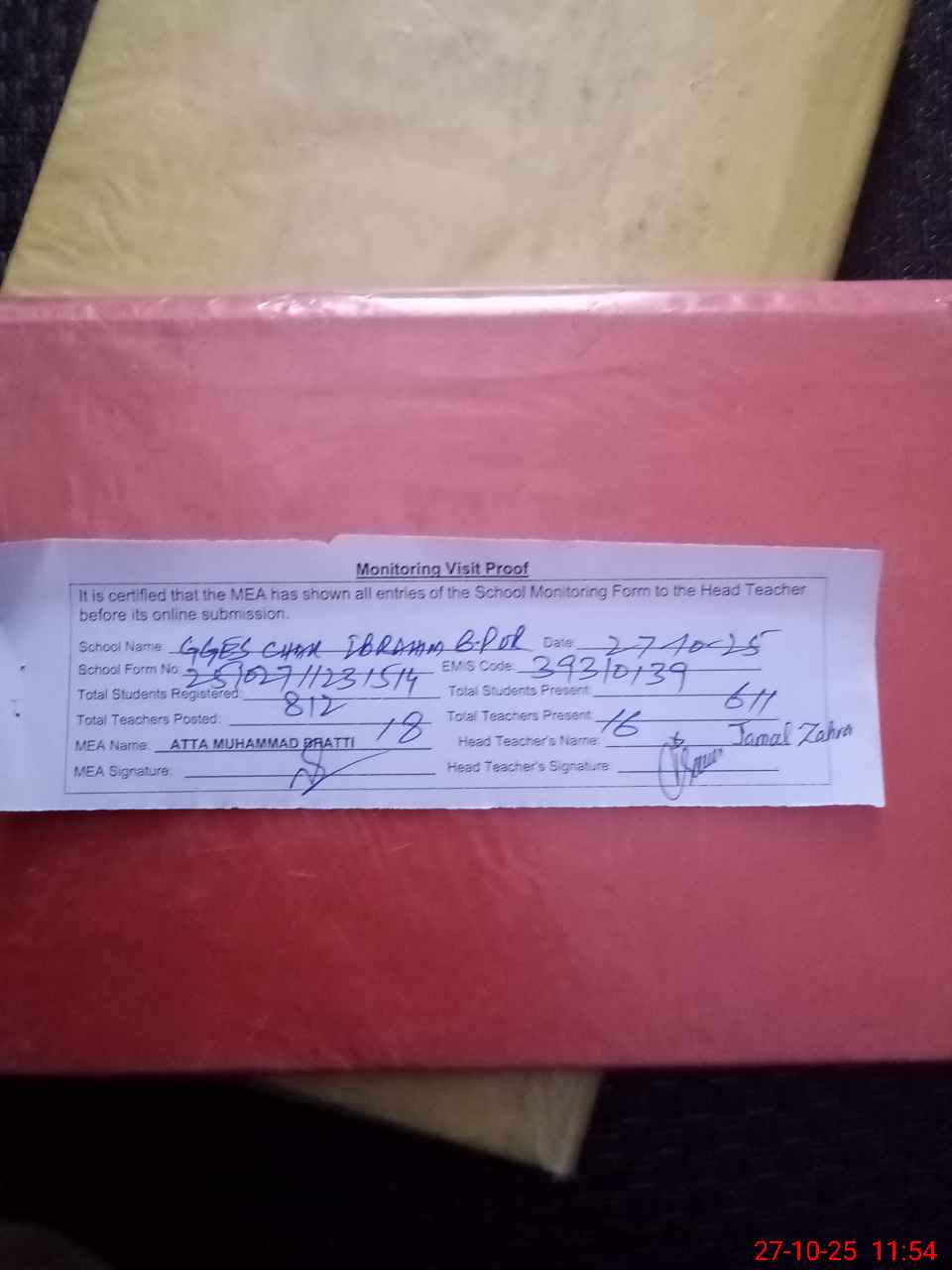 | Attendance Register | Head Teacher | MEA with School | Visit Proof |