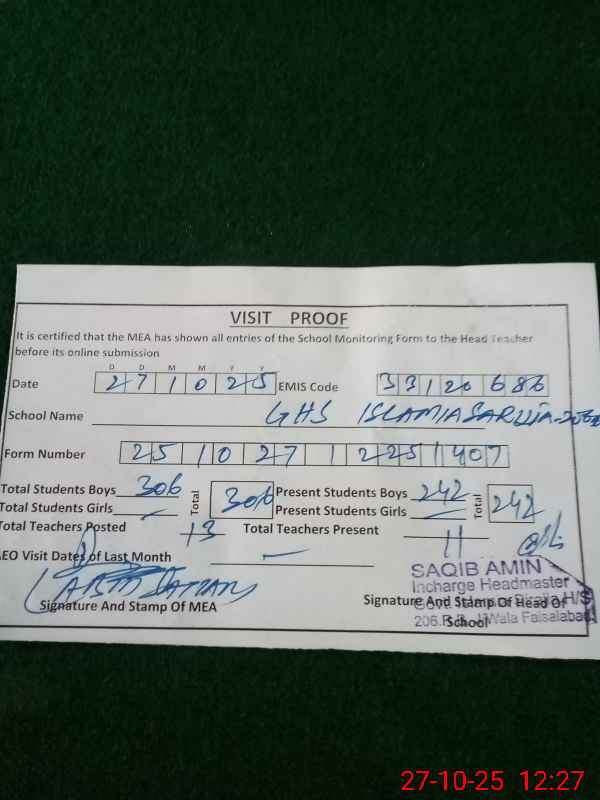 | EMIS Code: 33120686 | Name of School: GHS ISLAMIA SIRAJIA 206/RB | |||