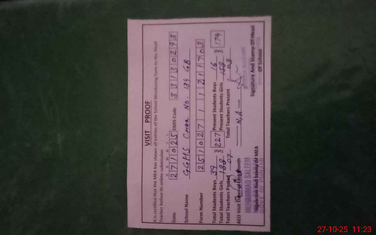 | EMIS Code: 33130293 | Name of School: GGHS CHAK NO 134 GB | |||