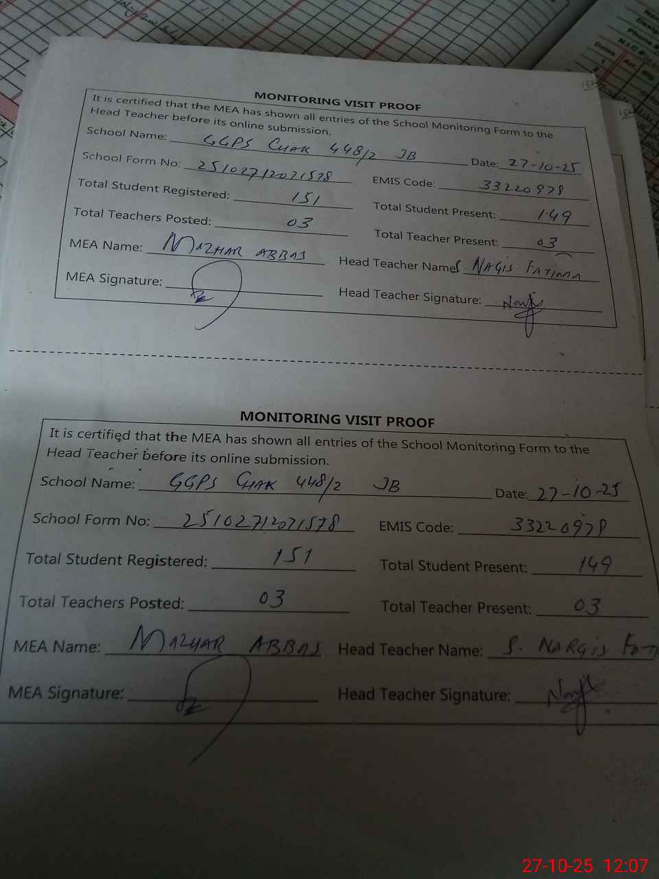 | Attendance Register | Head Teacher | MEA with School | Visit Proof |