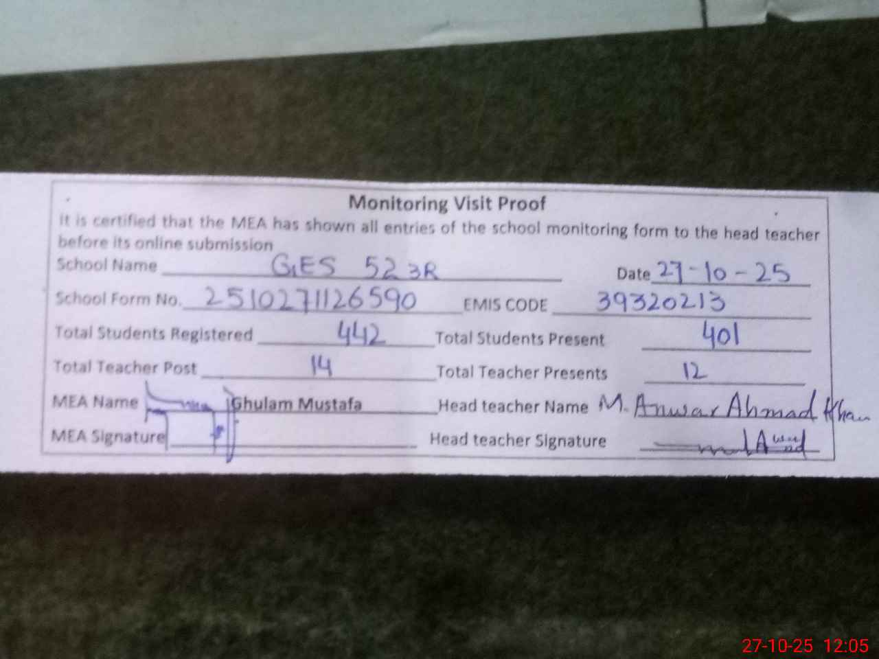 | Attendance Register | Head Teacher | MEA with School | Visit Proof |