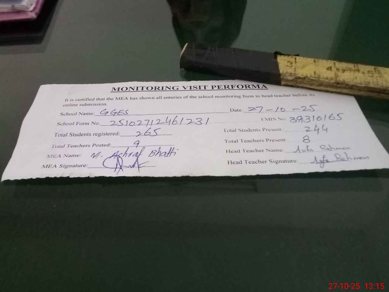 | Attendance Register | Head Teacher | MEA with School | Visit Proof |