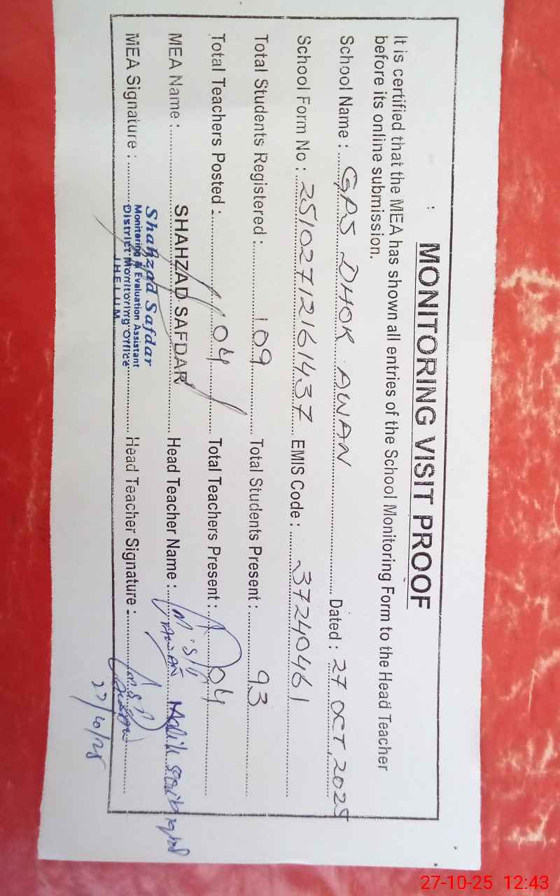 | EMIS Code: 37240461 | Name of School: GPS DHOK AWAN | |||