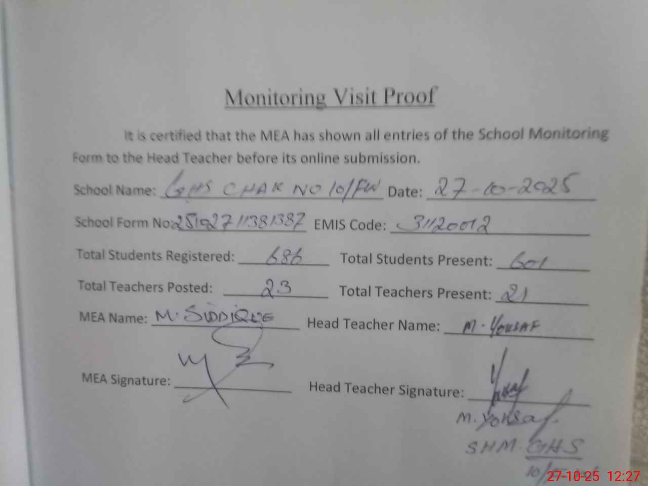 | Attendance Register | Head Teacher | MEA with School | Visit Proof |