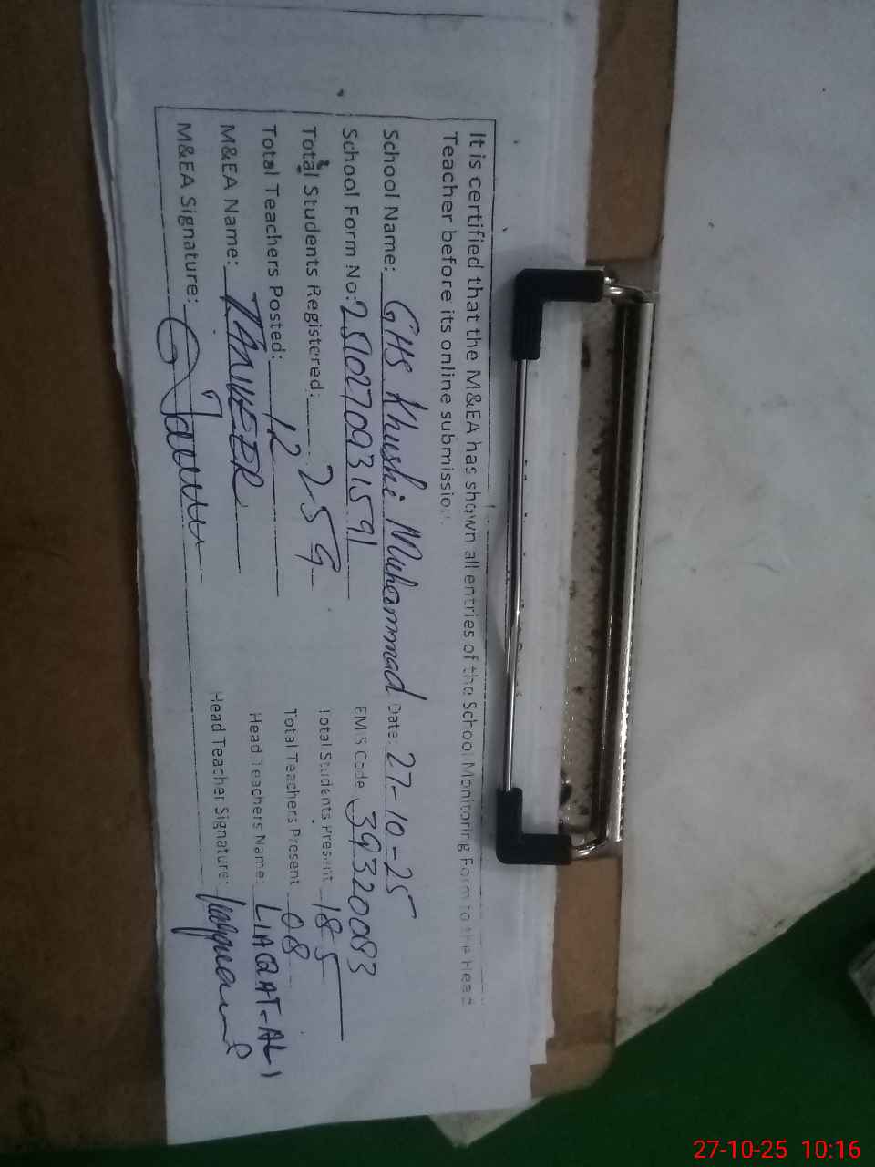 | Attendance Register | Head Teacher | MEA with School | Visit Proof |