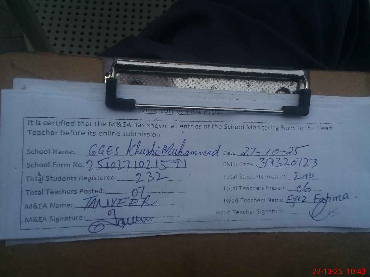| Attendance Register | Head Teacher | MEA with School | Visit Proof |