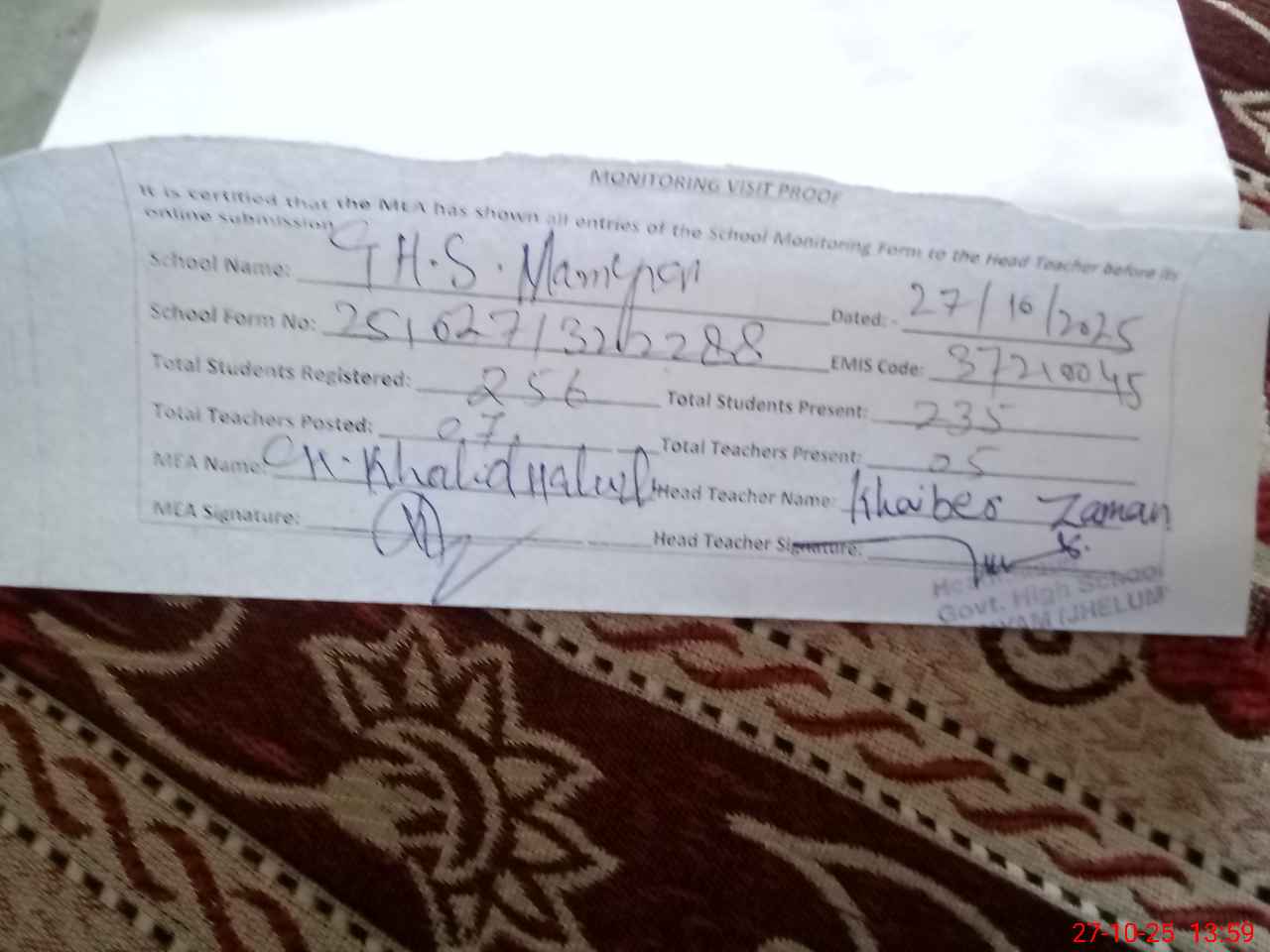 | Certified that this School was Inspected by the Undersigned MEA/DMO Today and the Information Stated Above is as Per Record. | |||||