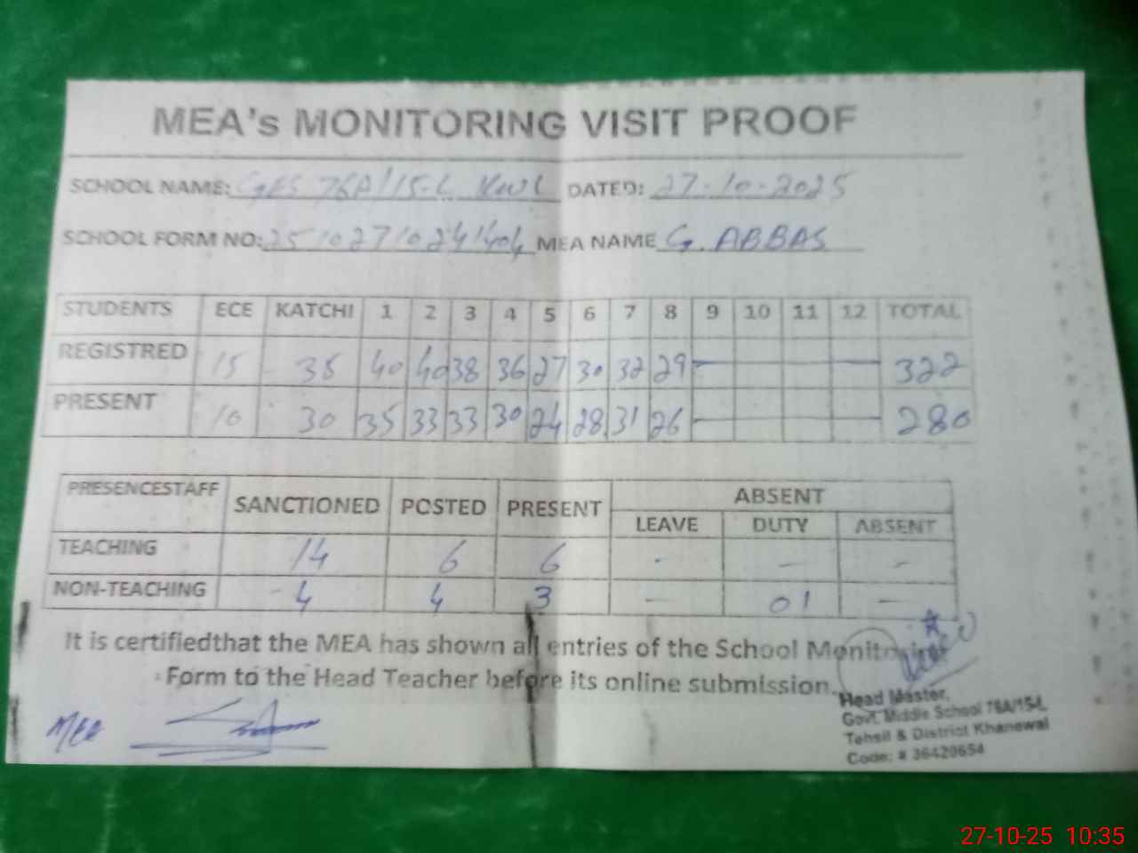 | Attendance Register | Head Teacher | MEA with School | Visit Proof |