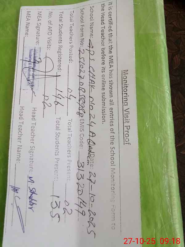 | Attendance Register | Head Teacher | MEA with School | Visit Proof |