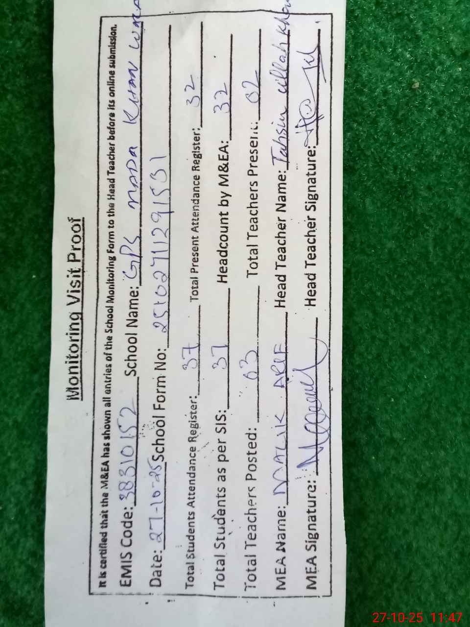 | Attendance Register | Head Teacher | MEA with School | Visit Proof |