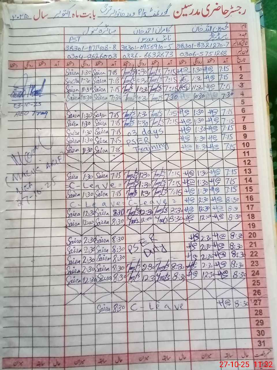 | CNIC | Full Name | Designation | R/C | Absence During Last Calender Month |