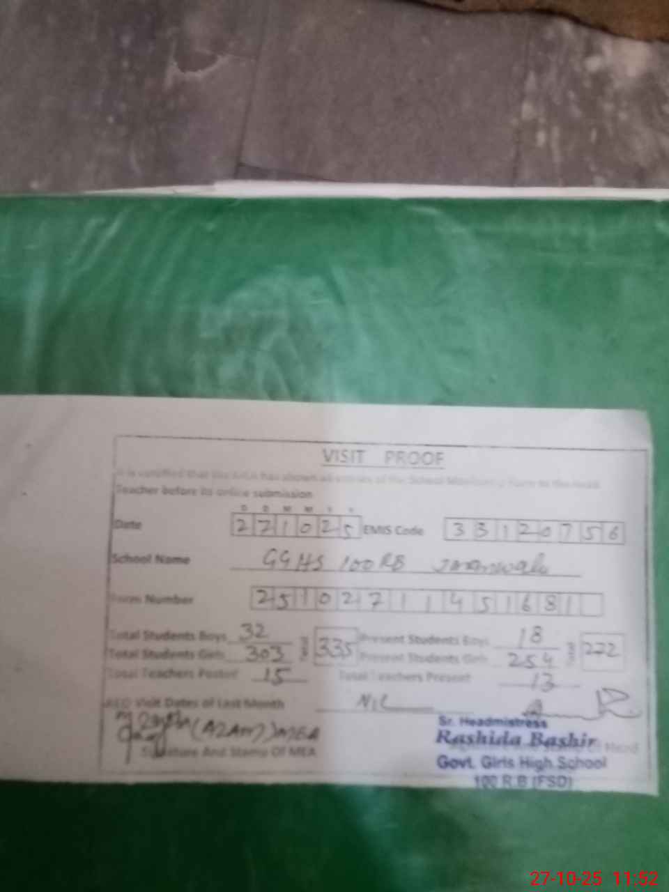 | EMIS Code: 33120756 | Name of School: GGHS CHAK 100 RB | |||