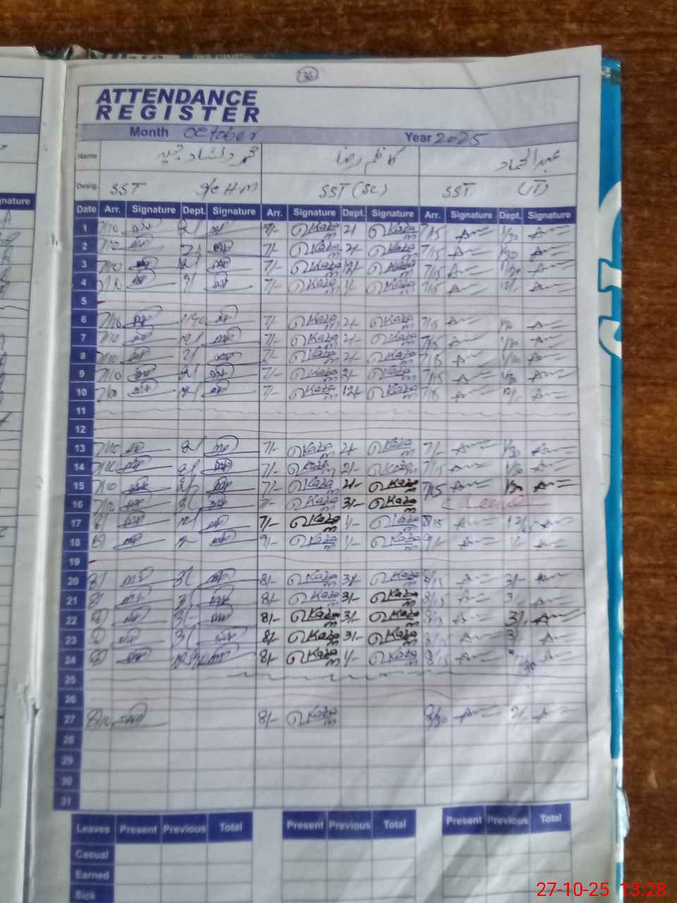 | CNIC | Full Name | Designation | R/C | Absence during last cal. month |