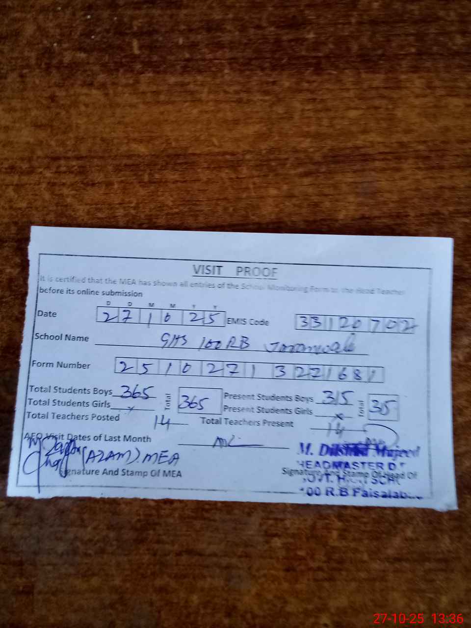 | Attendance Register | Head Teacher | MEA with School | Visit Proof |