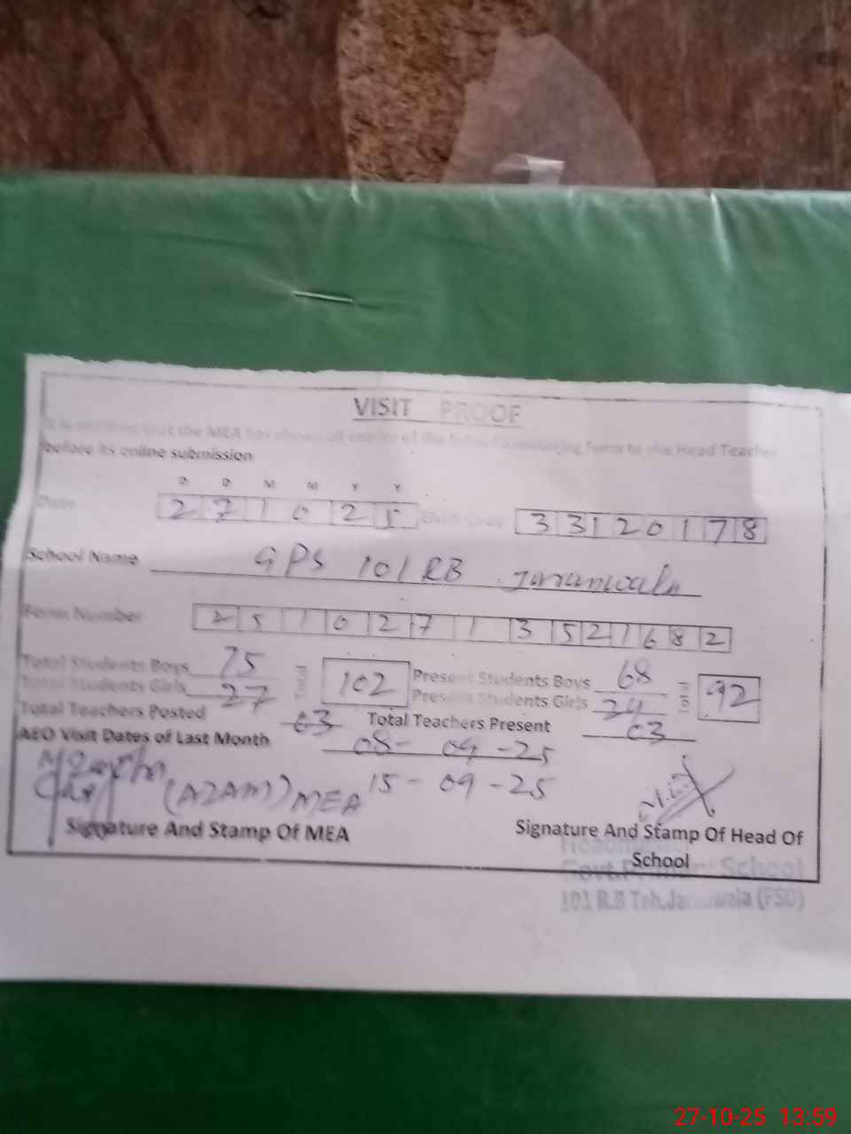 | EMIS Code: 33120178 | Name of School: GPS CHAK 101 RB I | |||