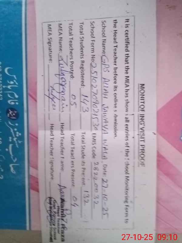 | EMIS Code: 38220032 | Name of School: GPS ALLAH JAWAYA WALA | |||
