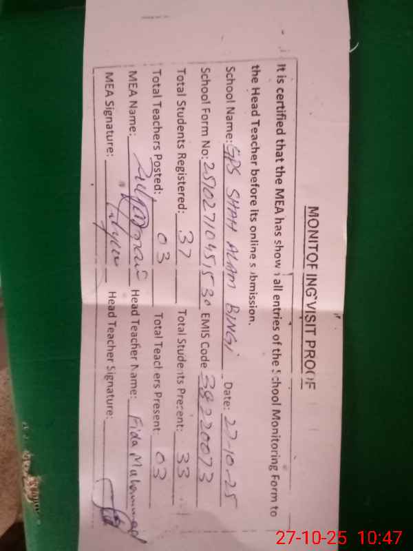 | EMIS Code: 38220073 | Name of School: GPS SHAH ALAM BINGI | |||