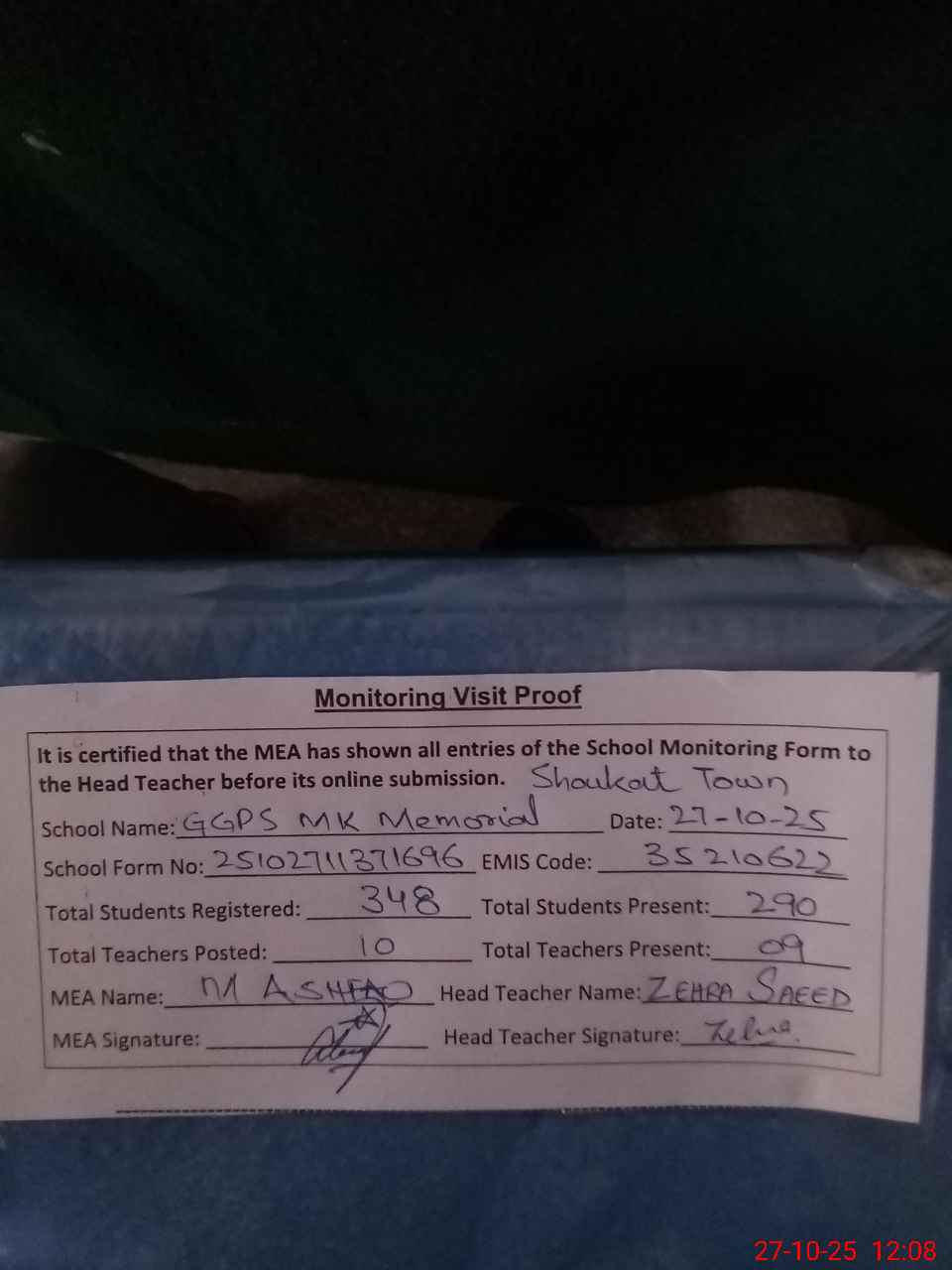 | Attendance Register | Head Teacher | MEA with School | Visit Proof |