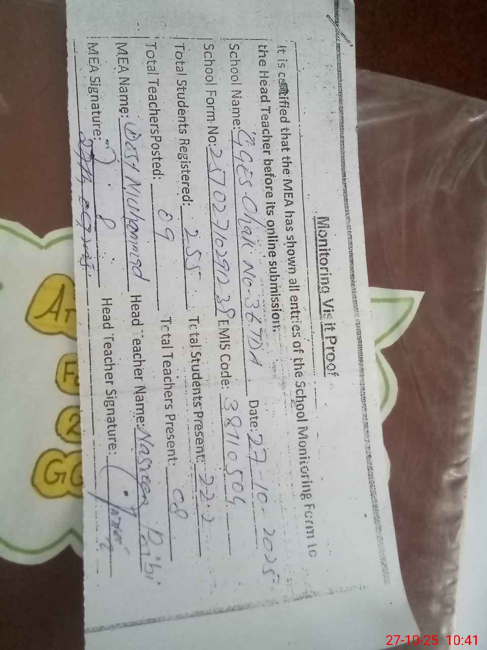 | Attendance Register | Head Teacher | MEA with School | Visit Proof |