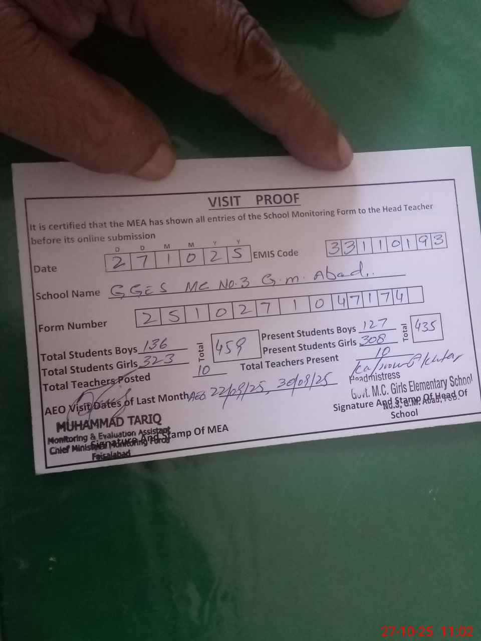 | EMIS Code: 33110193 | Name of School: GGES MC NO.3 GHULAM MUHAMMAD ABAD FSD | |||