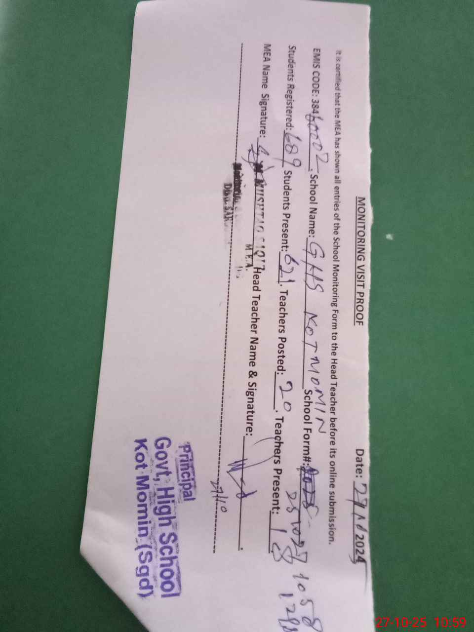| EMIS Code: 38460002 | Name of School: GHS KOT MOMIN SALAM ROAD | |||