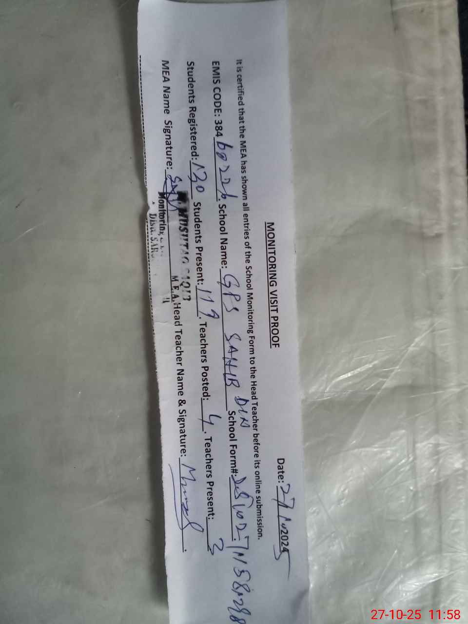 | Attendance Register | Head Teacher | MEA with School | Visit Proof |