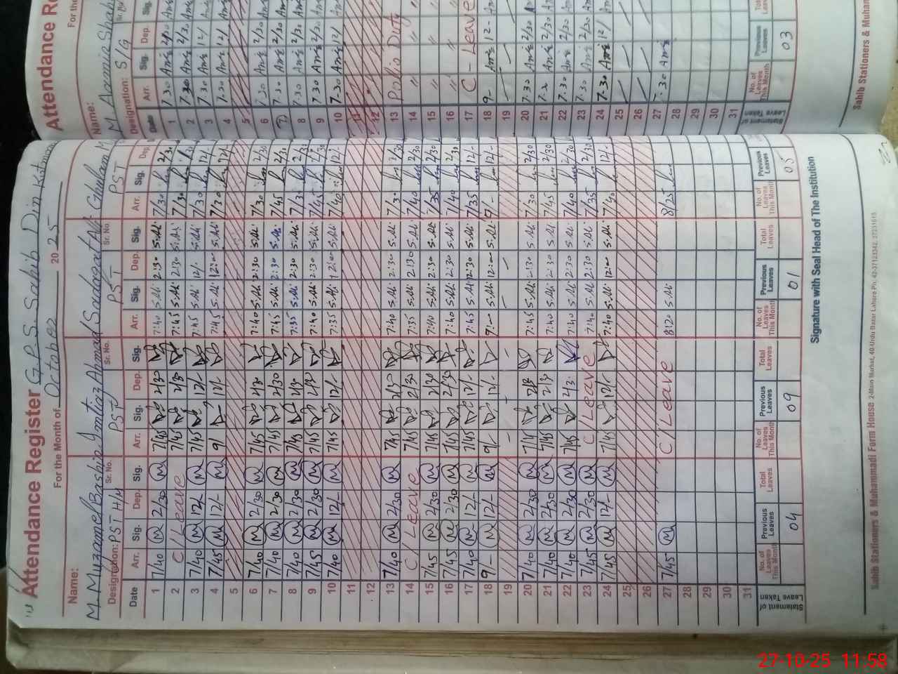 | CNIC | Full Name | Designation | R/C | Absence During Last Calender Month |