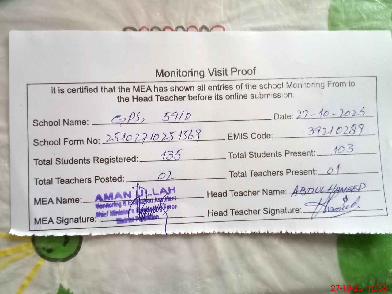 | Attendance Register | Head Teacher | MEA with School | Visit Proof |