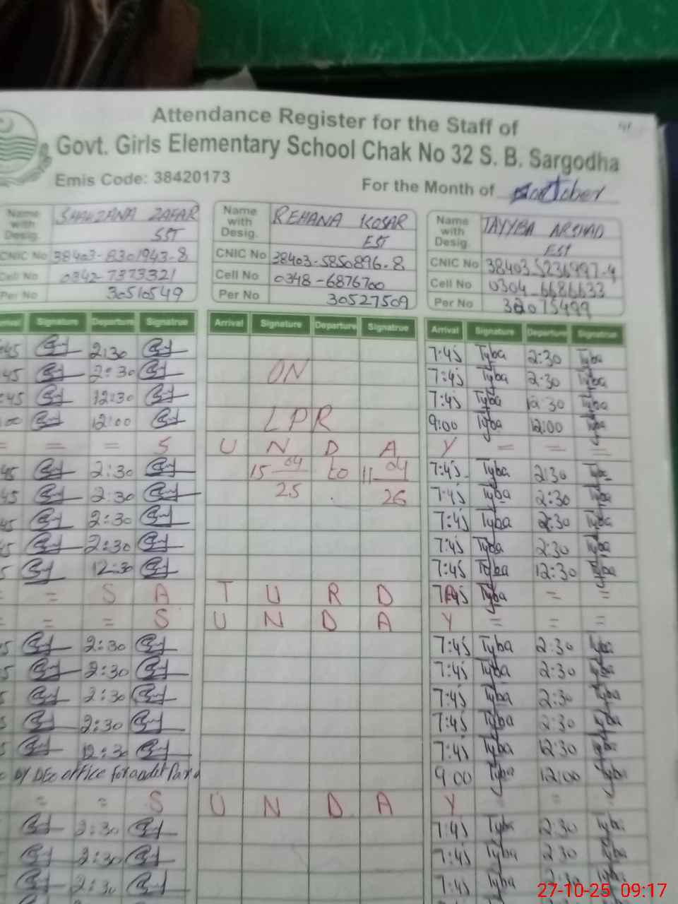 | CNIC | Full Name | Designation | R/C | Absence during last cal. month |