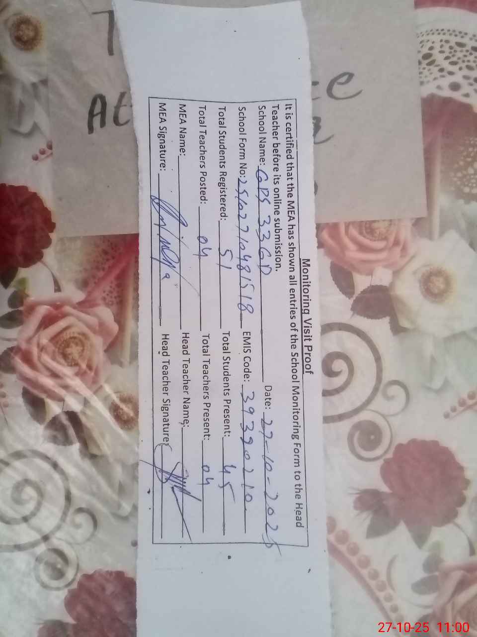 | Attendance Register | Head Teacher | MEA with School | Visit Proof |