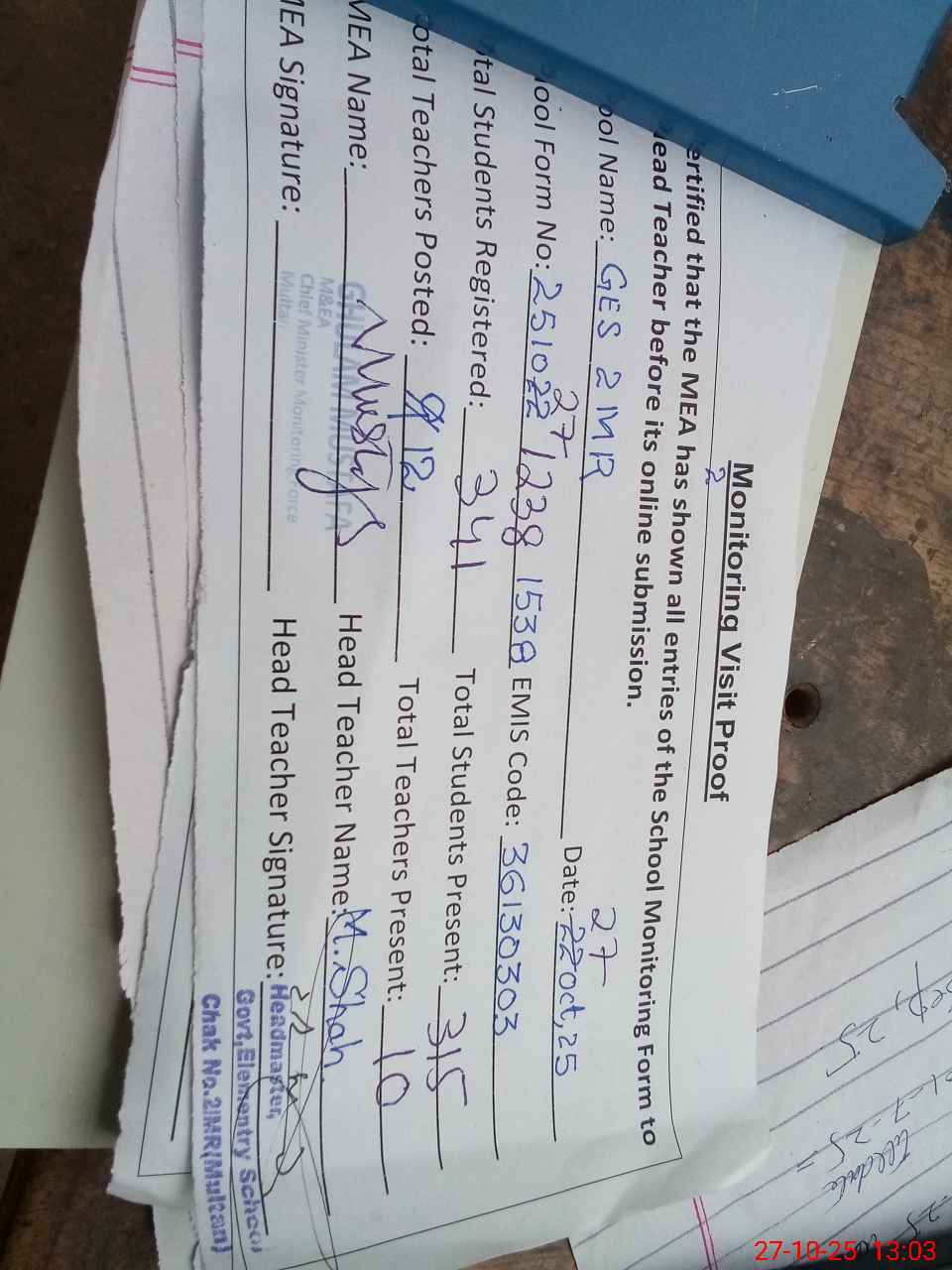 | Attendance Register | Head Teacher | MEA with School | Visit Proof |