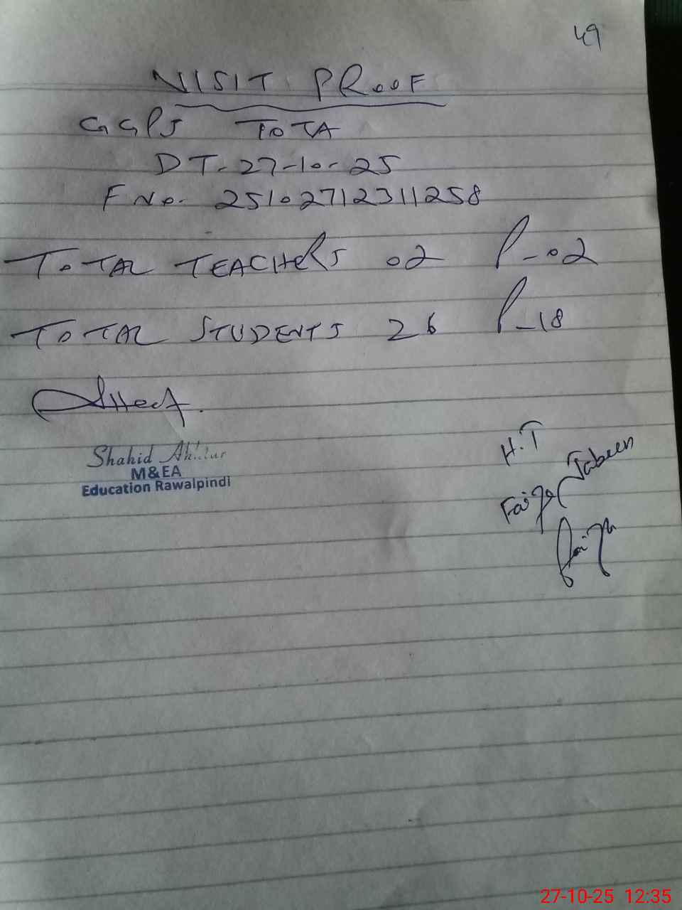 | Name: Fa**** Ja**** Designation: (School Headmaster's/Headmistress's) PST Phone/Cell Number: 03**** |