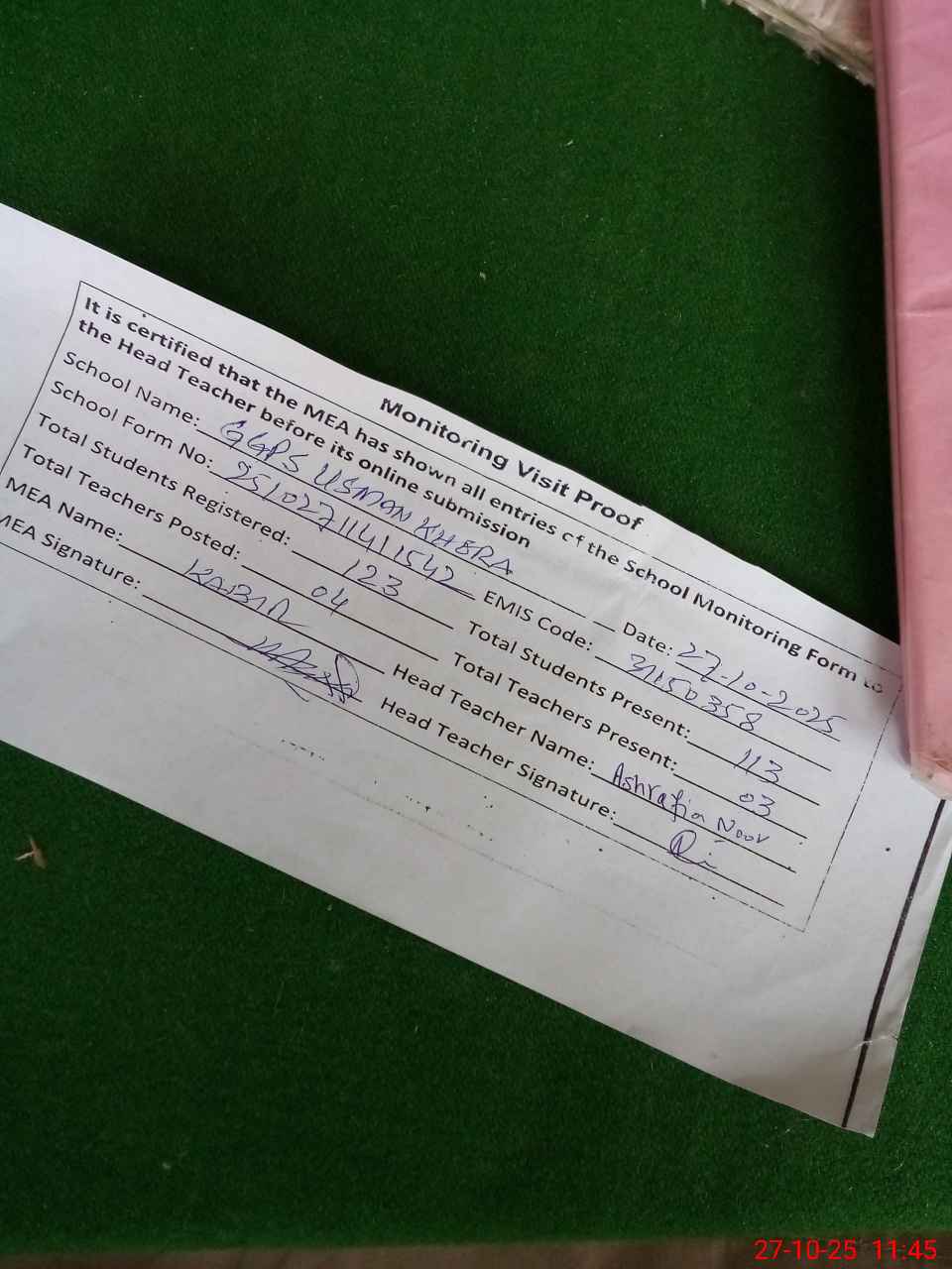 | Attendance Register | Head Teacher | MEA with School | Visit Proof |