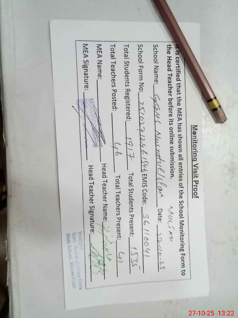 | Attendance Register | Head Teacher | MEA with School | Visit Proof |