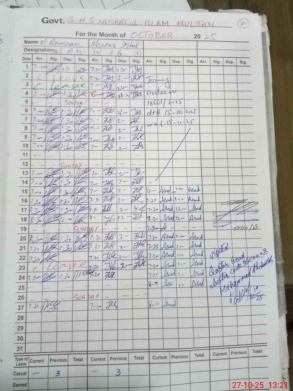| CNIC | Full Name | Designation | R/C | Absence During Last Calender Month |