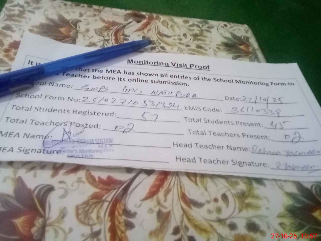 | Attendance Register | Head Teacher | MEA with School | Visit Proof |