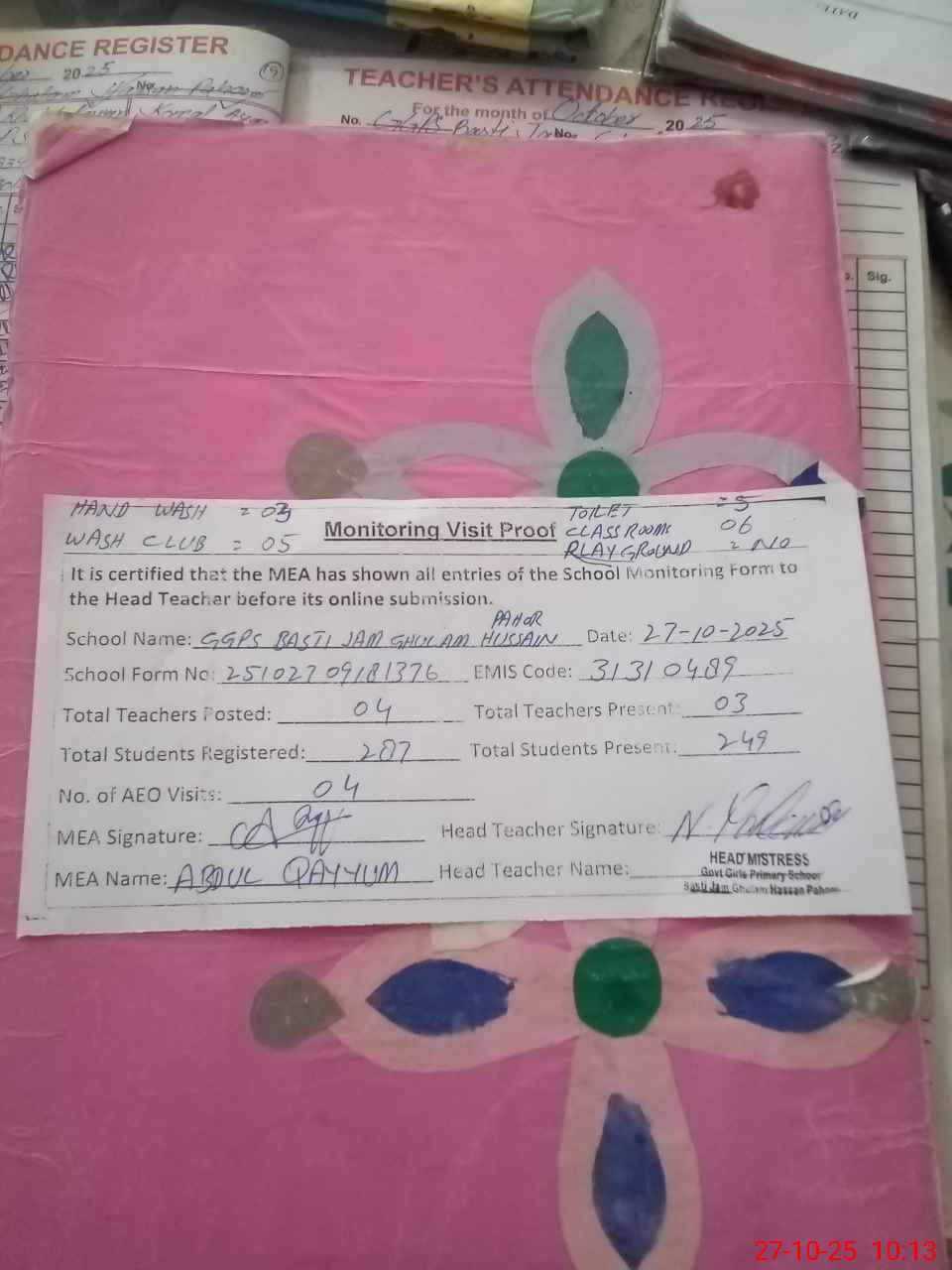 | Attendance Register | Head Teacher | MEA with School | Visit Proof |