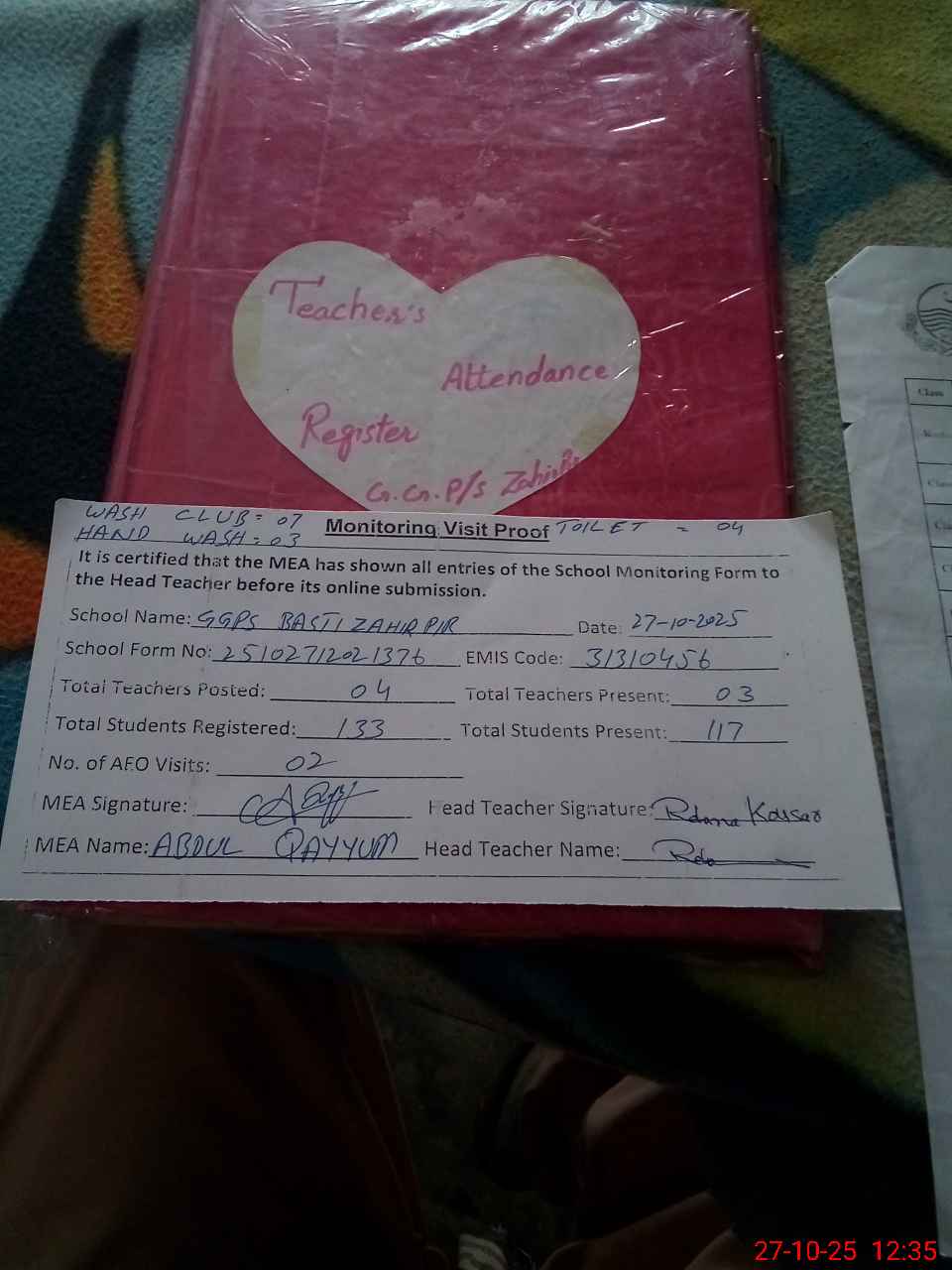 | Attendance Register | Head Teacher | MEA with School | Visit Proof |