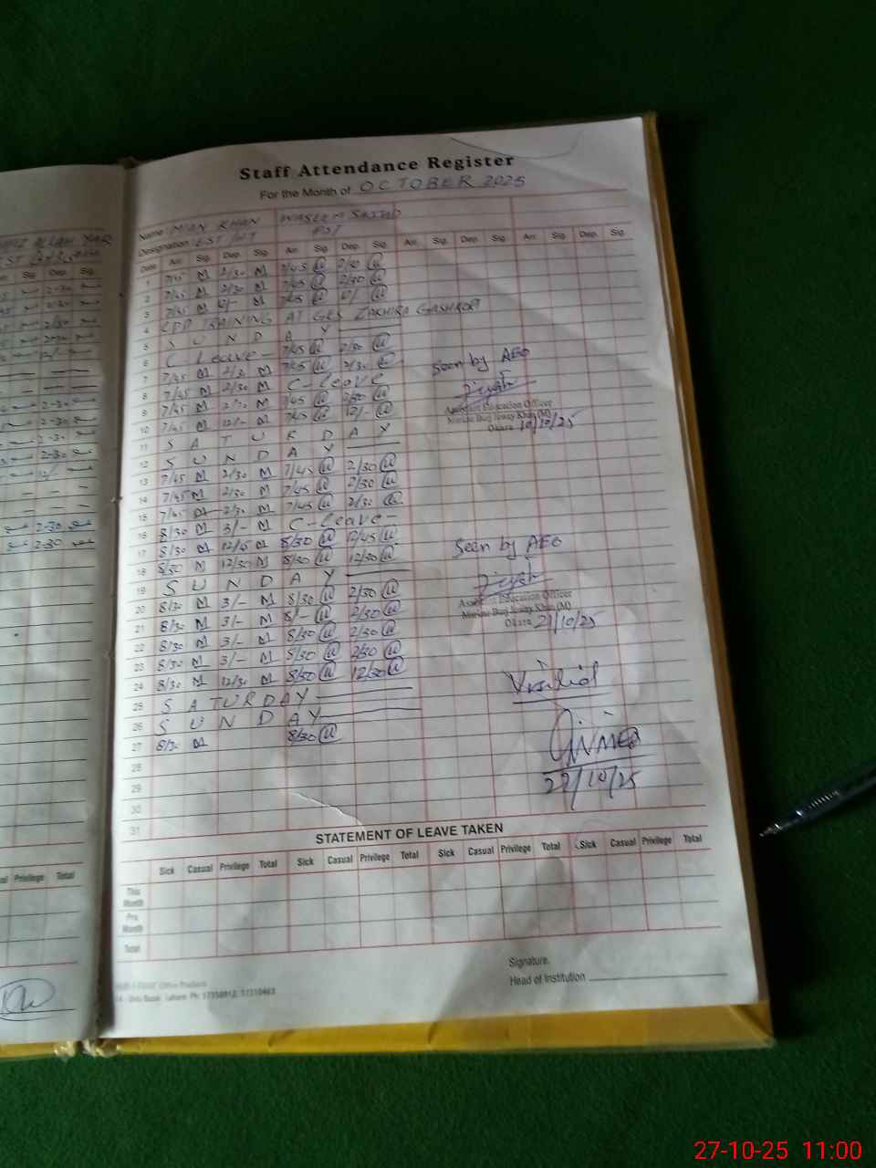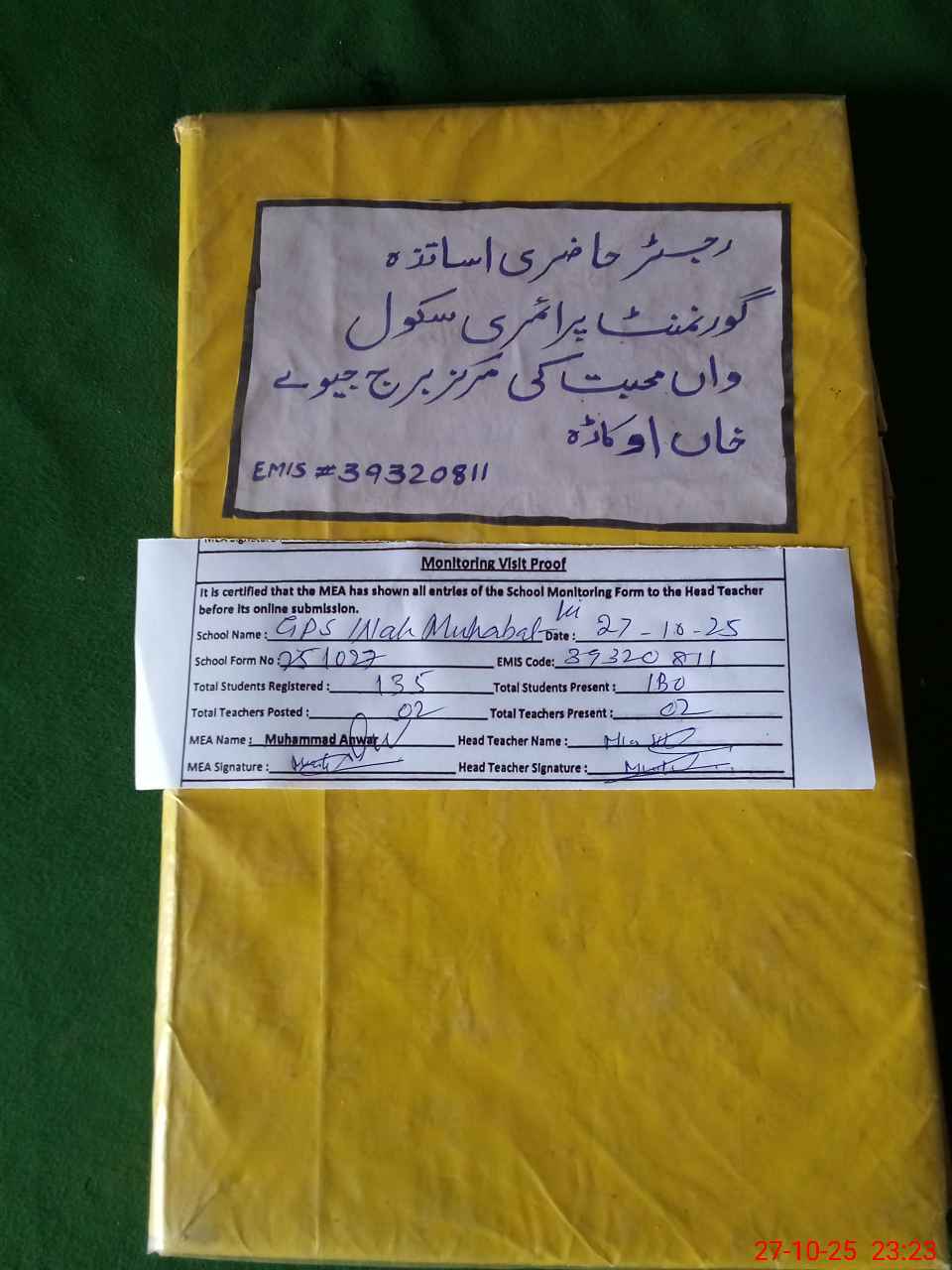 | Attendance Register | Head Teacher | MEA with School | Visit Proof |