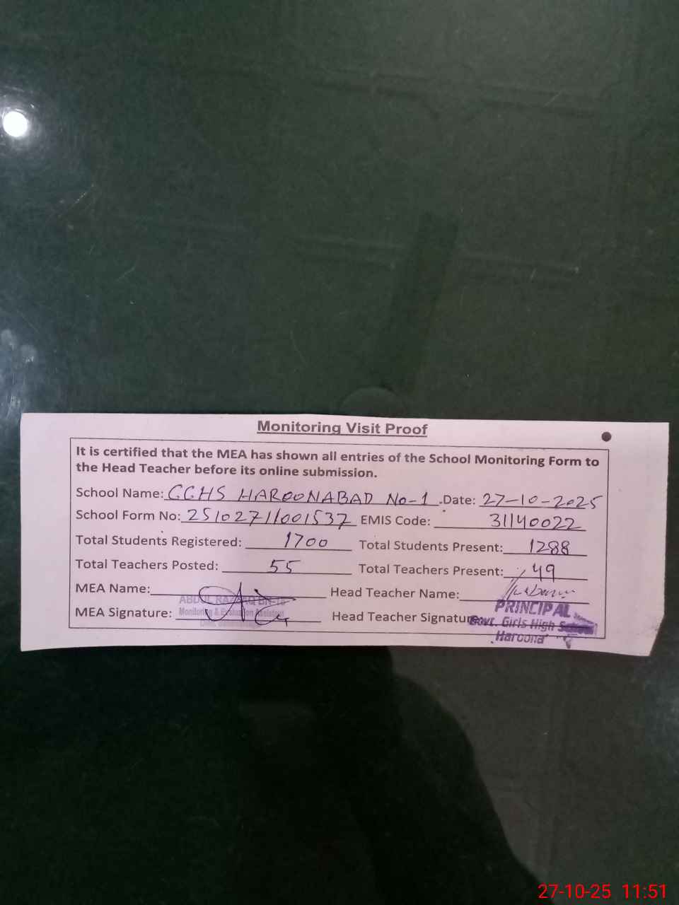 | EMIS Code: 31140022 | Name of School: GGHS HAROON ABAD WARD NO. 1 | |||