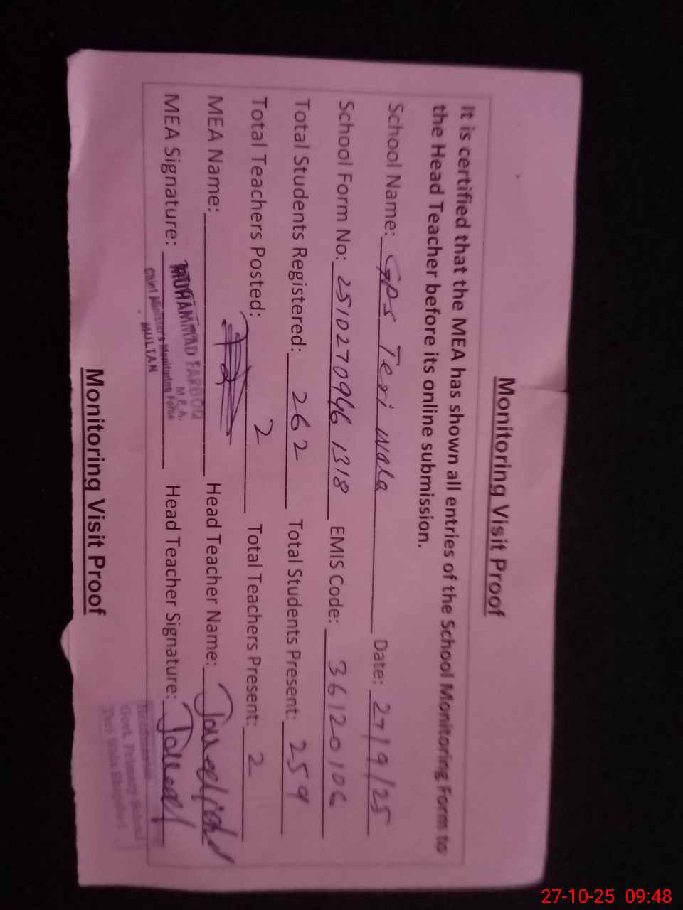 | Attendance Register | Head Teacher | MEA with School | Visit Proof |
