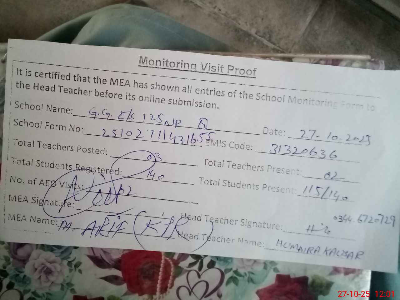 | Attendance Register | Head Teacher | MEA with School | Visit Proof |