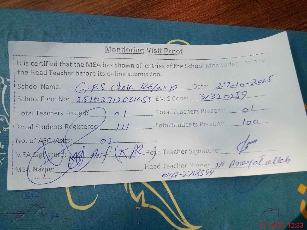 | EMIS Code: 31320259 | Name of School: GPS CHAK 126 NP | |||