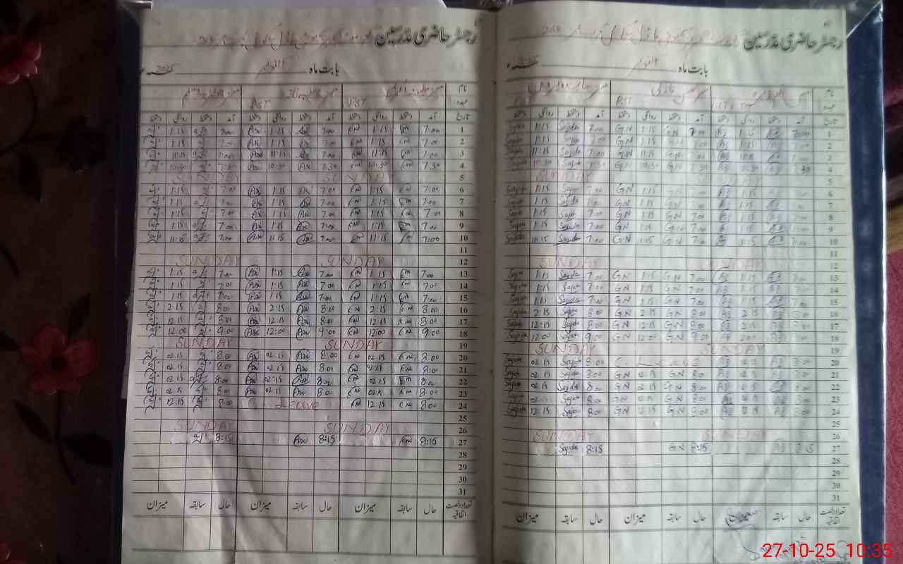 | CNIC | Full Name | Designation | R/C | Absence During Last Calender Month |