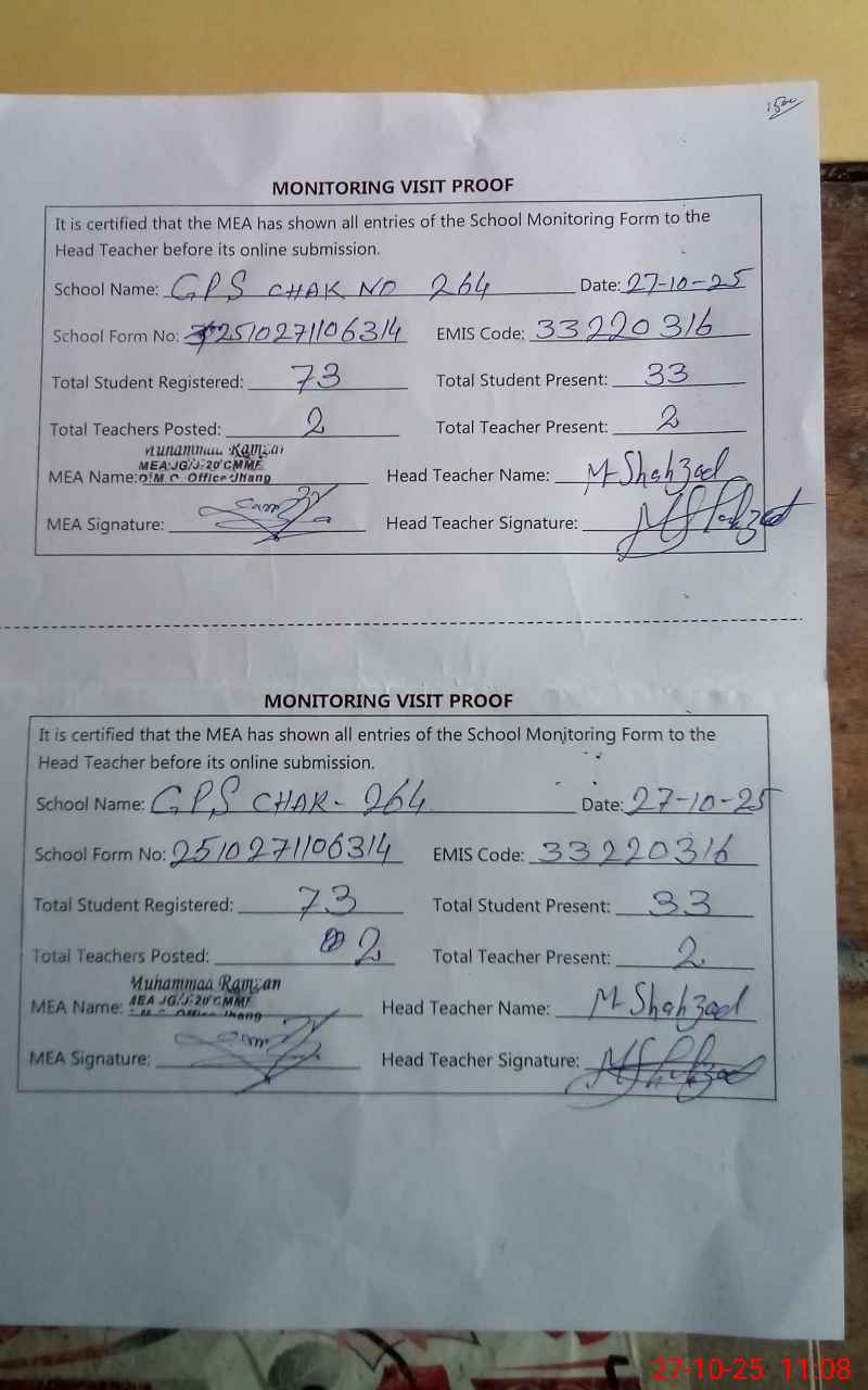 | EMIS Code: 33220316 | Name of School: GPS CHAK NO 264 JB | |||