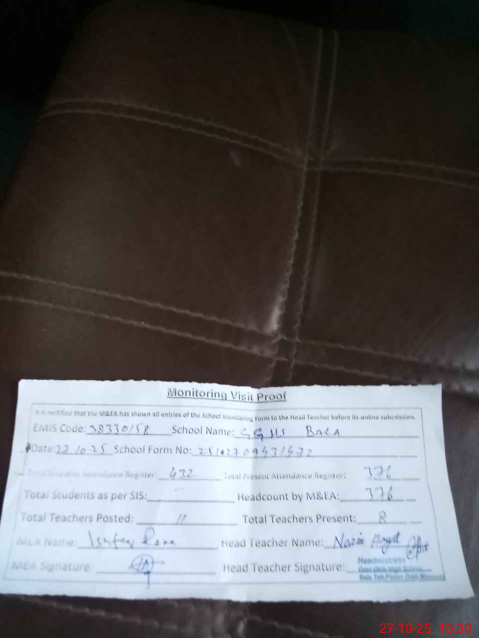 | Attendance Register | Head Teacher | MEA with School | Visit Proof |
